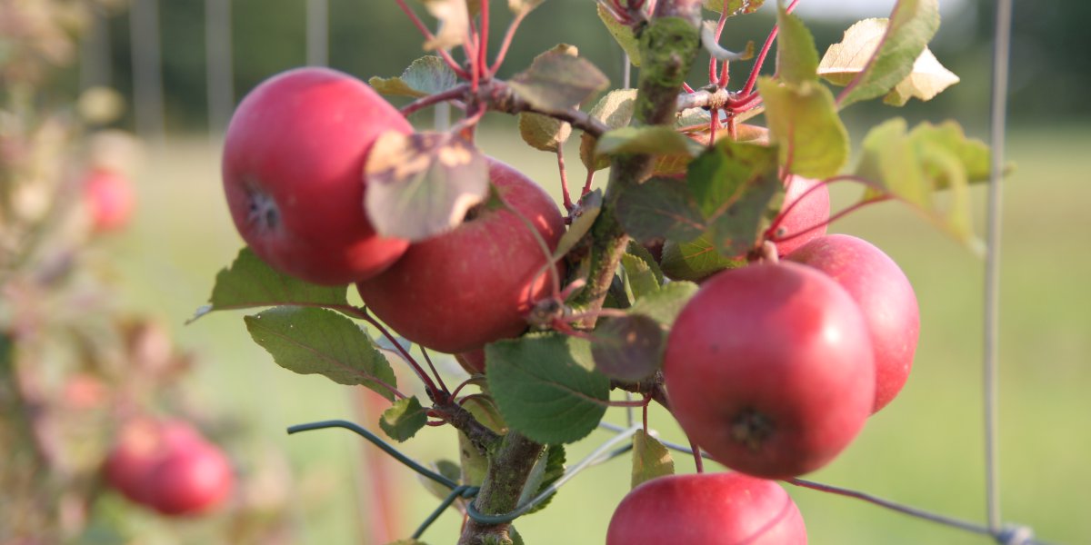 Die Apfelbüsche rund um das Gartengelände werden als Spalierobst gepflegt. Sie stammen aus einem Züchtungsprojekt mit dem Ziel neue rotfrüchtige und rotfleischige süße kleinkronige Apfelbäume heranzuziehen. Die ersten tragen schon Früchte und wir beginnen in diesem Jahr für uns nicht geeignete Pflanzen auszusortieren, damit die für uns interessanten Apfelbüsche mehr Platz am Zaun bekommen. Wir geben geeignete Apfelbüsche gegen eine Spende für unseren Verein gerne an Privatgärten ab.